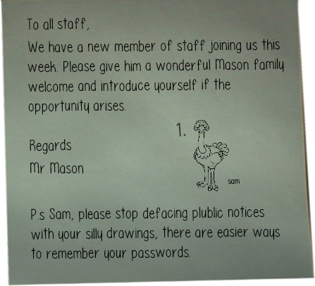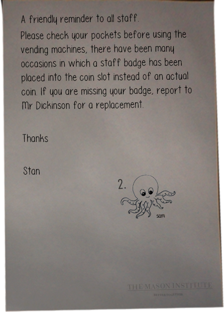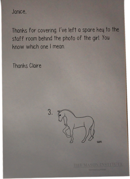 There's a key here. There's a key chain on it. It says "Mr Mason's office spare".